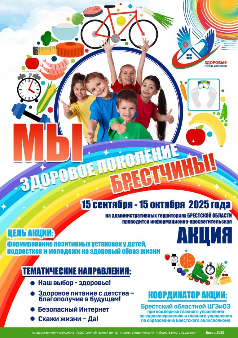 С целью осуществления комплексных информационно-образовательных профилактических мероприятий на межведомственной основе, направленных на изменение отношения детей и подростков к здоровому образу жизни как к личному и общественному приоритету, их участия в мероприятиях, в рамках реализации Плана мероприятий по реализации Программы деятельности национальной сети «Здоровые города и поселки» на территории Брестской области на 2024-2025 годы в учреждениях образования Кобринского района в период с 15 сентября по 15 октября 2025 года проводится областная информационно-просветительская акция «Мы — здоровое поколение Брестчины!».