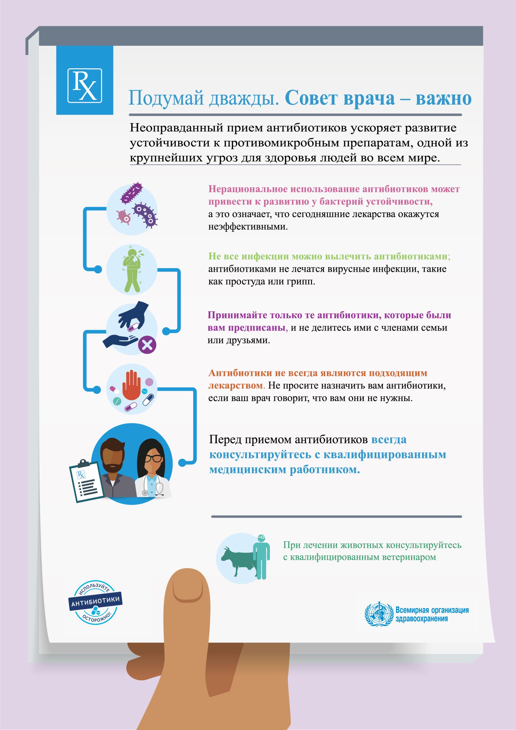 Распространение знаний у населения — очень важный аспект. Необходимо добиться понимания, что антибактериальная терапия — не лечение кашля, антибиотик — не антидепрессант, не препарат, снижающий температуру и т. д. Антимикробную терапию следует использовать при наличии обоснованных показаний для их применения. Объяснить вред несоблюдения пациентом предписанного режима дозирования и опасность самолечения антибиотиками.